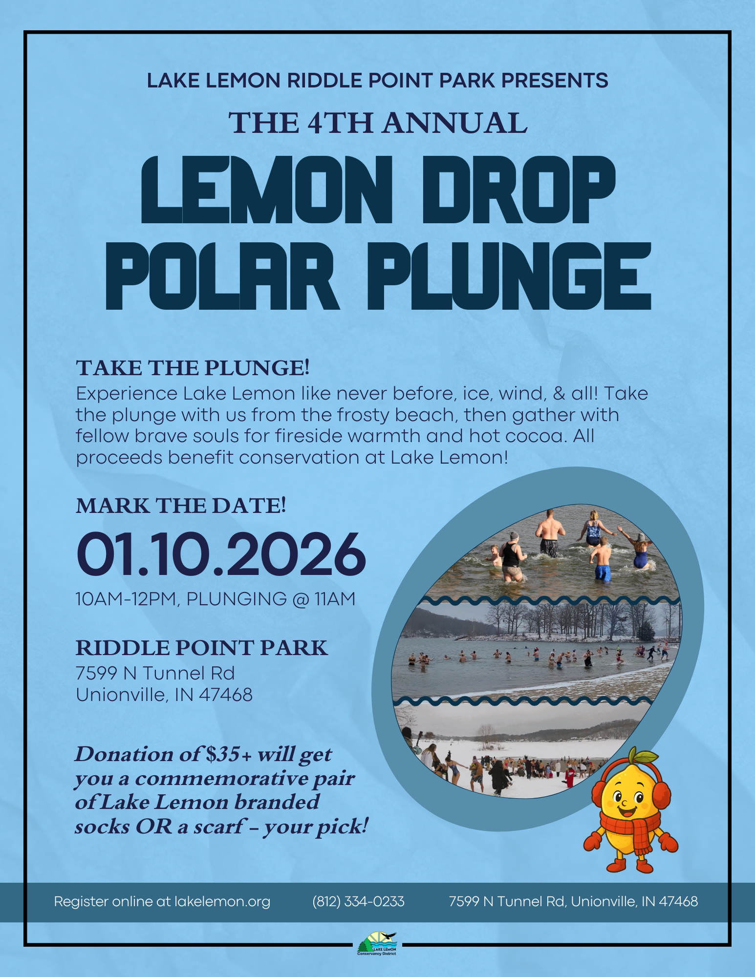 On January 10th, 2026, we will be plunging at 11:00am sharp so plan to be here around 10:30am to make sure you have finished your registration and checked in with us at the Shelter House. A suggested donation of $10 will directly benefit the Lake Lemon Conservancy District and the Boys and Girls Clubs of Bloomington. Unique event merch will be available for donations over $35.